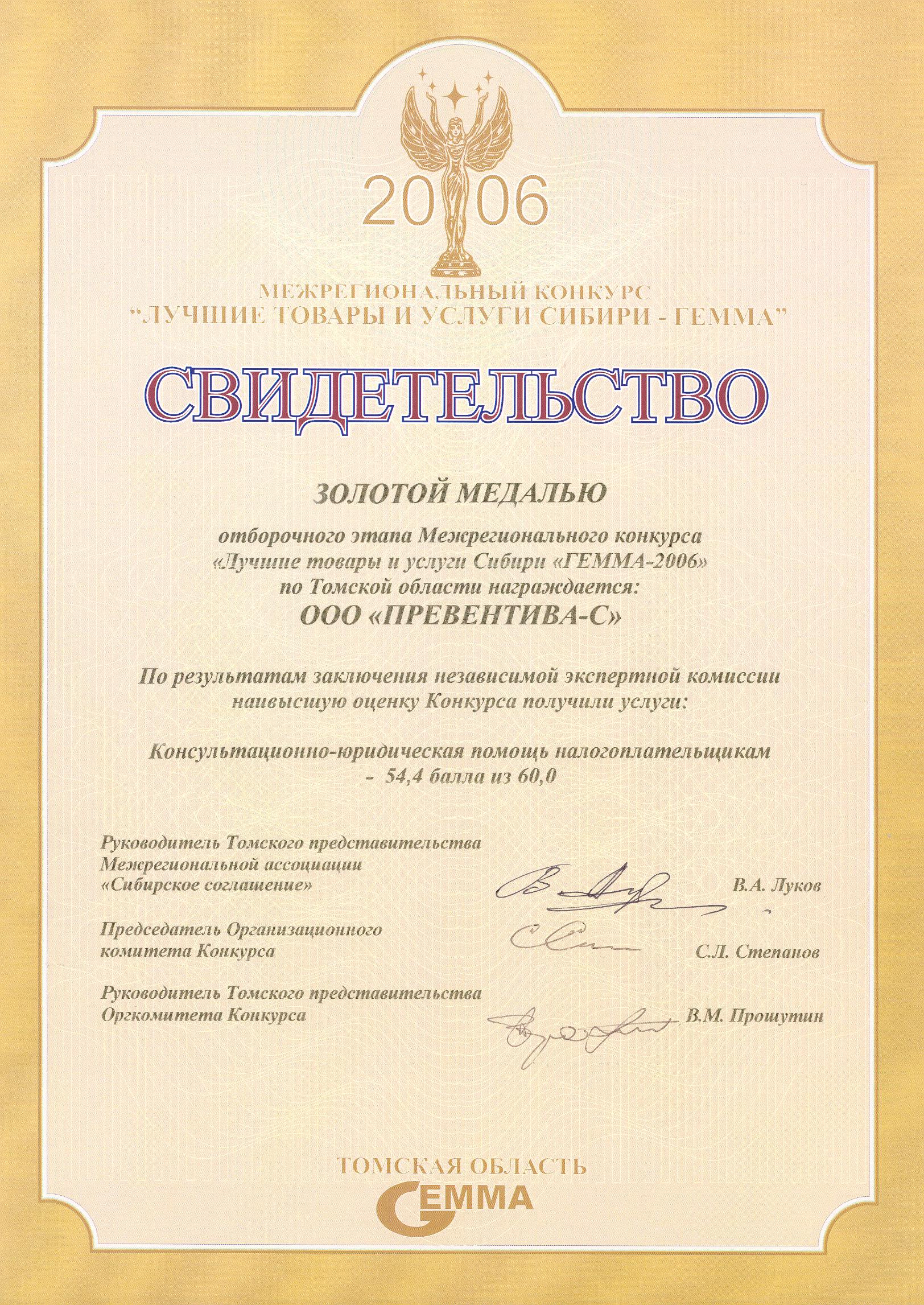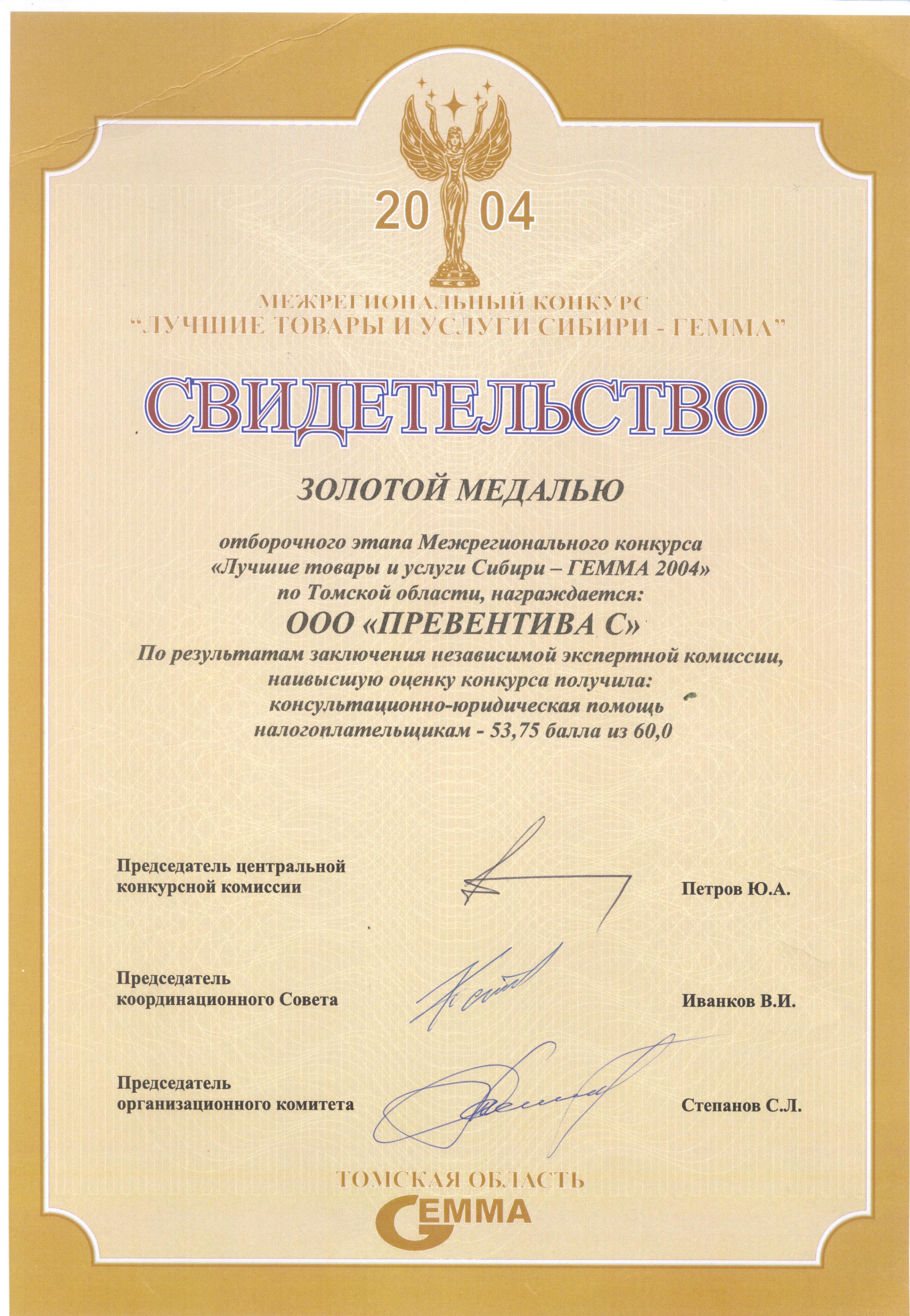 Конкурс «Лучшие товары и услуги Сибири — Гемма» — это межрегиональный проект, реализуемый под патронажем Межрегиональной ассоциации «Сибирское соглашение». Конкурс «ГЕММА» проводит работу с 2002 года на территории 60 регионов России и 64 стран мира в том числе и в Томской области. «Превентива» в 2004 году была награждена золотой медалью за лучшие товары и услуги Сибири по Томской области, получив наивысшую оценку 53,75 из 60 баллов за консультационно-юридическую помощь налогоплательщикам.