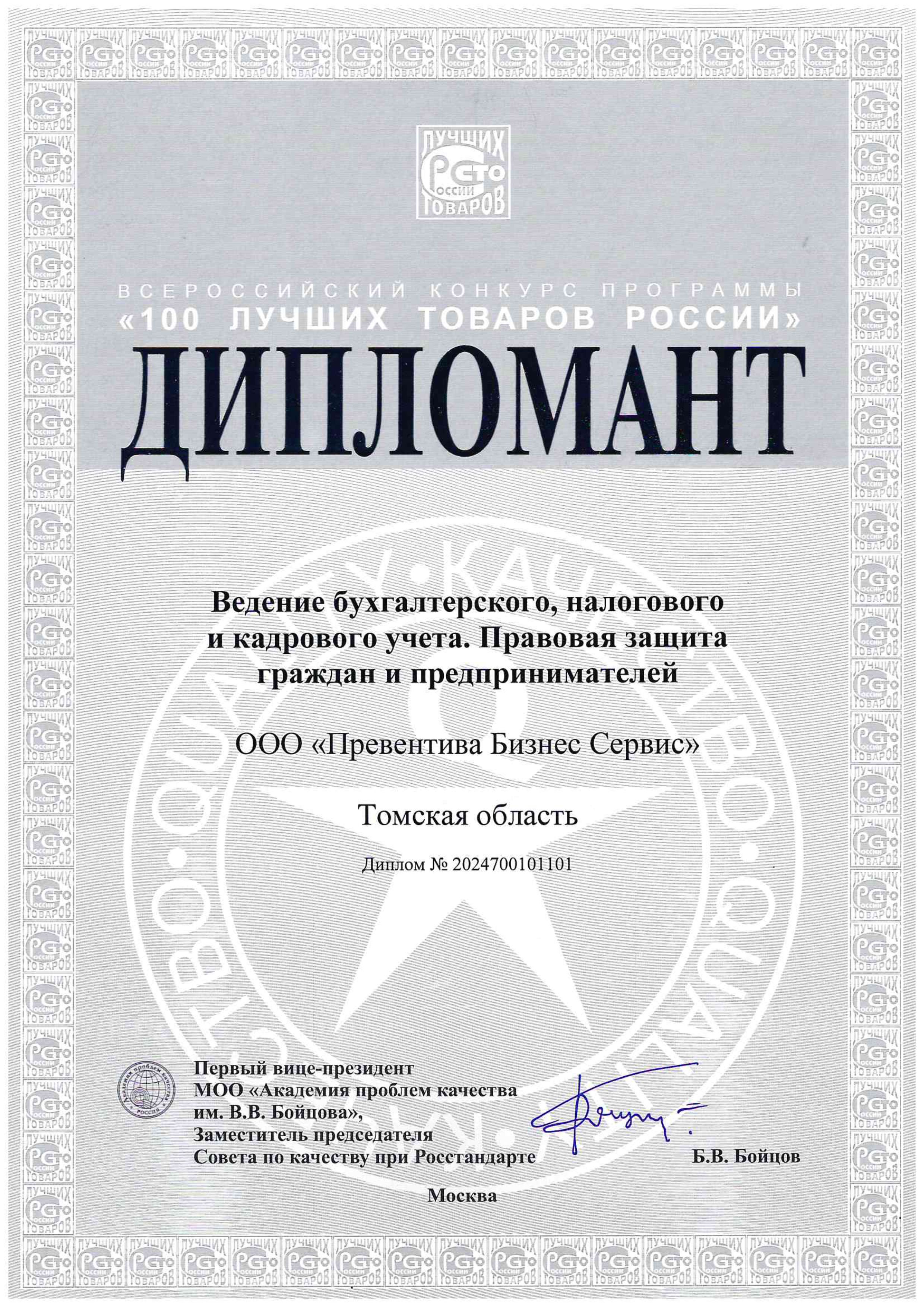Конкурс «100 лучших товаров России» проводится с 1998 года по инициативе Государственного комитета Российской Федерации по стандартизации и метрологии (ныне – Росстандарт), общественной организации «Академия проблем качества» и информагентства «Стандарты и качество». В 2022 году Дипломом лауреата регионального этапа конкурса были отмечены услуги в области бухгалтерского учета и налогового консультирования. Этот успех стал важным этапом в истории компании, демонстрируя её вклад в развитие стандартов качества в сфере бухгалтерского и налогового консалтинга. Получение такого признания — не только почет, но и признание того, что «Превентива» соответствует самым высоким требованиям в своей нише.